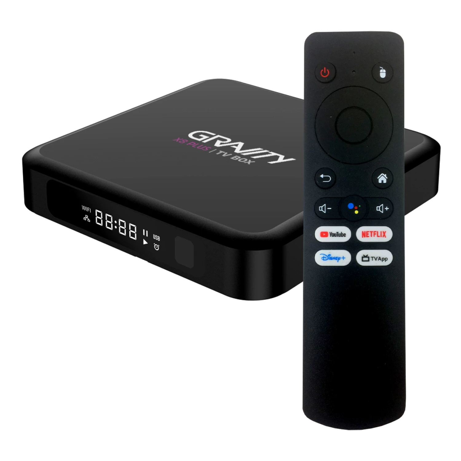El Gravity X8 Plus es un potente TV Box con Android 12, diseñado para transformar cualquier televisor en un centro multimedia completo. Su diseño compacto y moderno incluye una pantalla digital frontal que muestra la hora, el estado del WiFi y dispositivos conectados, ofreciendo una experiencia visual más intuitiva.